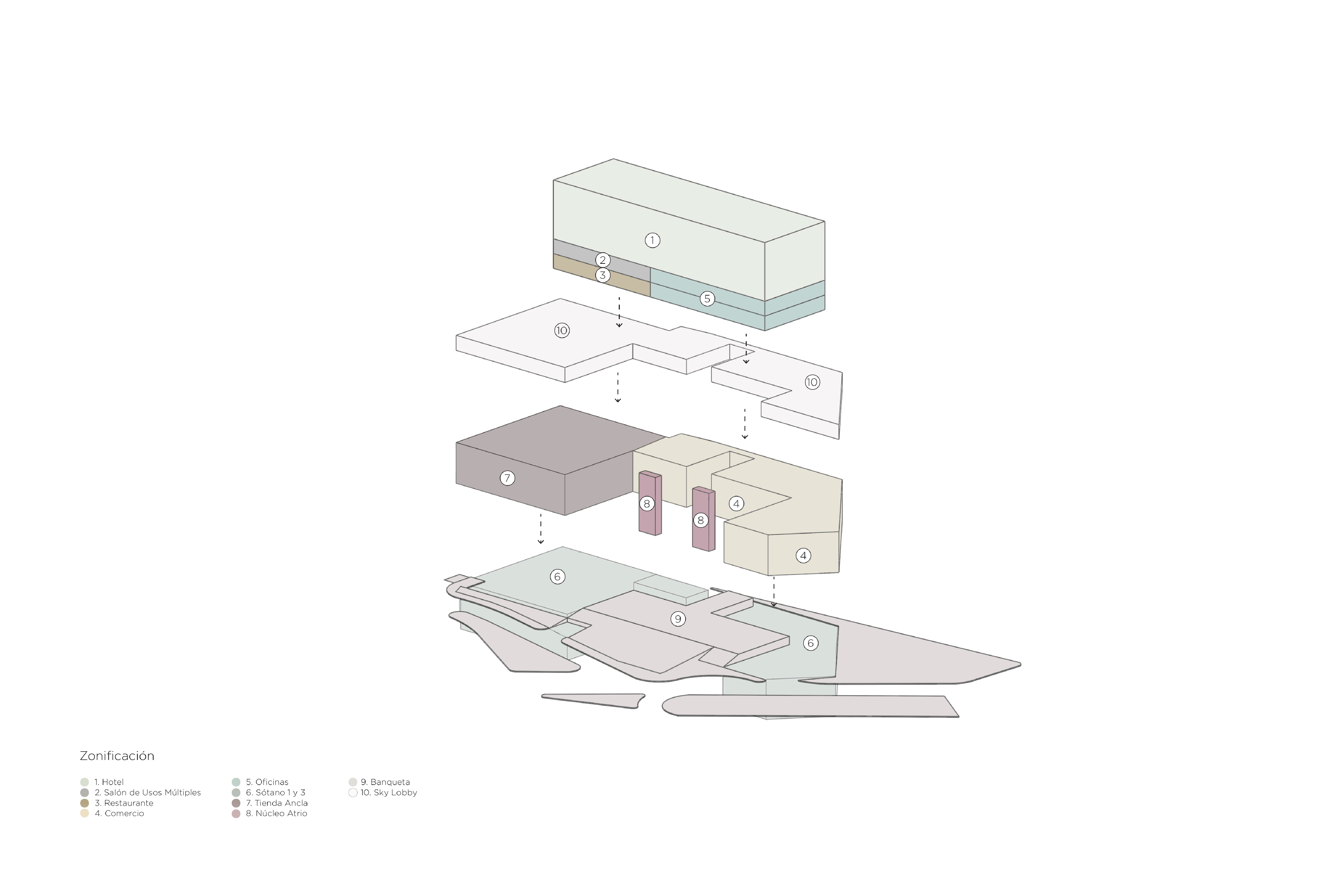 Las principales ramas de uso del desarrollo contemplan hotel, oficina y comercio, con la finalidad de aumentar el indicativo económico de la zona. Esta tipografía se ha planteado como una estrategia de costura entre escalas urbanas muy diferenciadas; una medición entre edificios y grandes superficies.