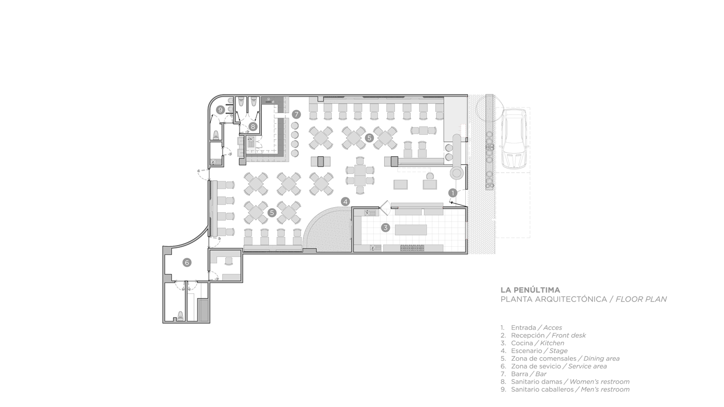 Antes de convertirse en restaurante, el inmueble albergaba un uso completamente diferente, lo que implicó un proceso de reinterpretación espacial y funcional. Al tratarse de una remodelación, la estructura existente condicionó el diseño del nuevo layout. Se respetaron elementos clave como la ubicación de la barra y los baños, integrándolos de manera coherente a la nueva propuesta espacial. Esta condición llevó a una optimización del espacio y a un ejercicio de diseño que dialoga con lo preexistente, transformándolo sin perder su lógica original.