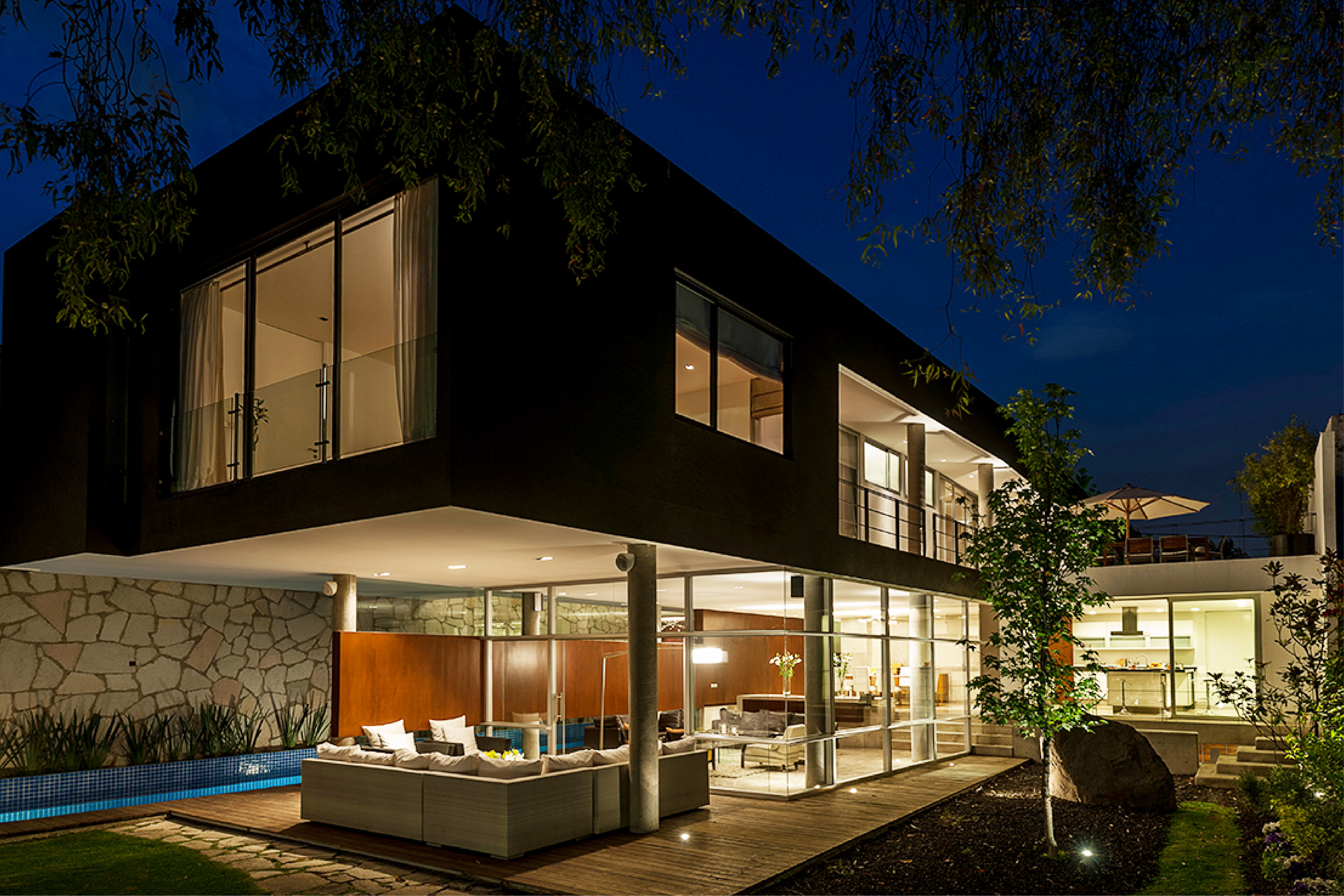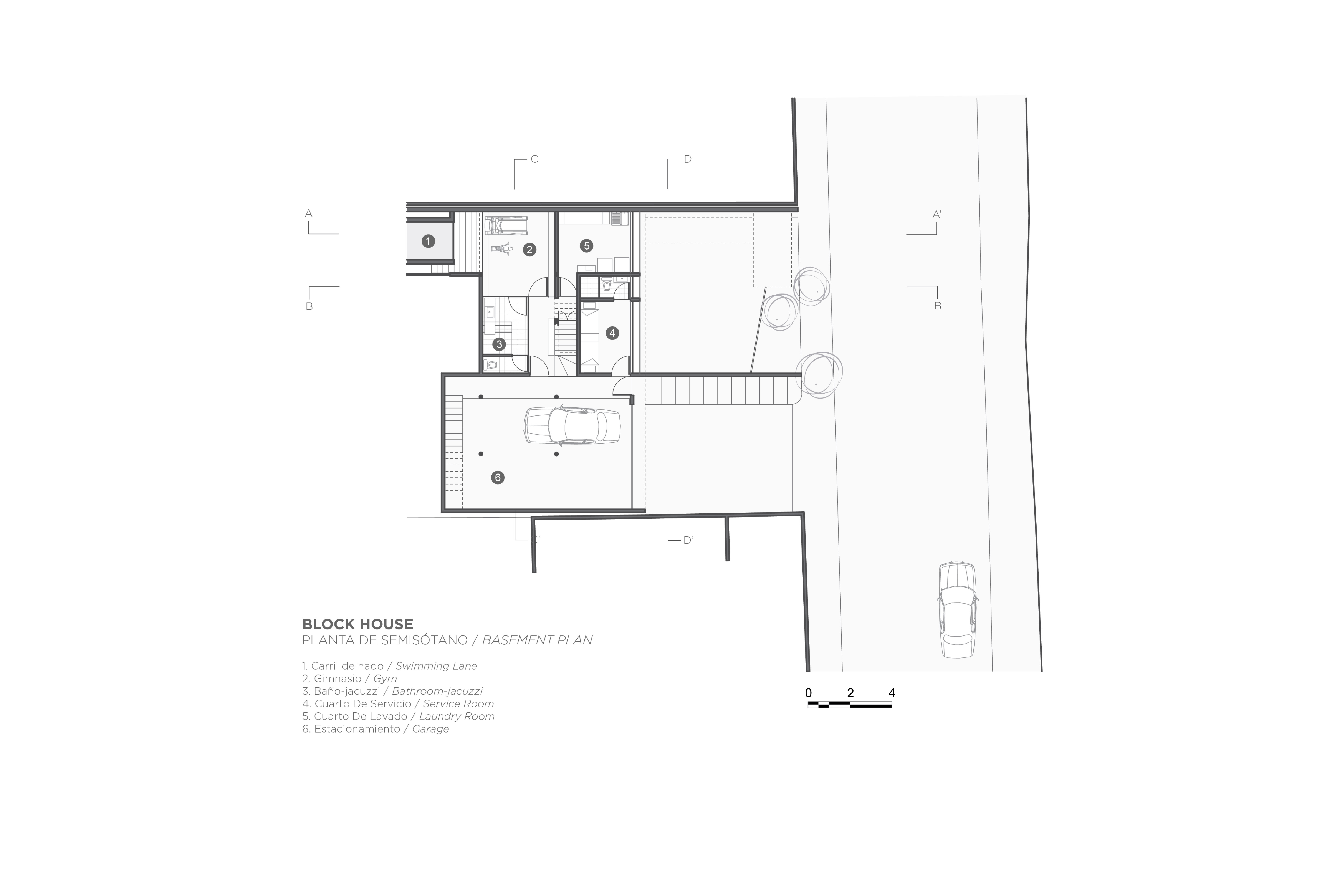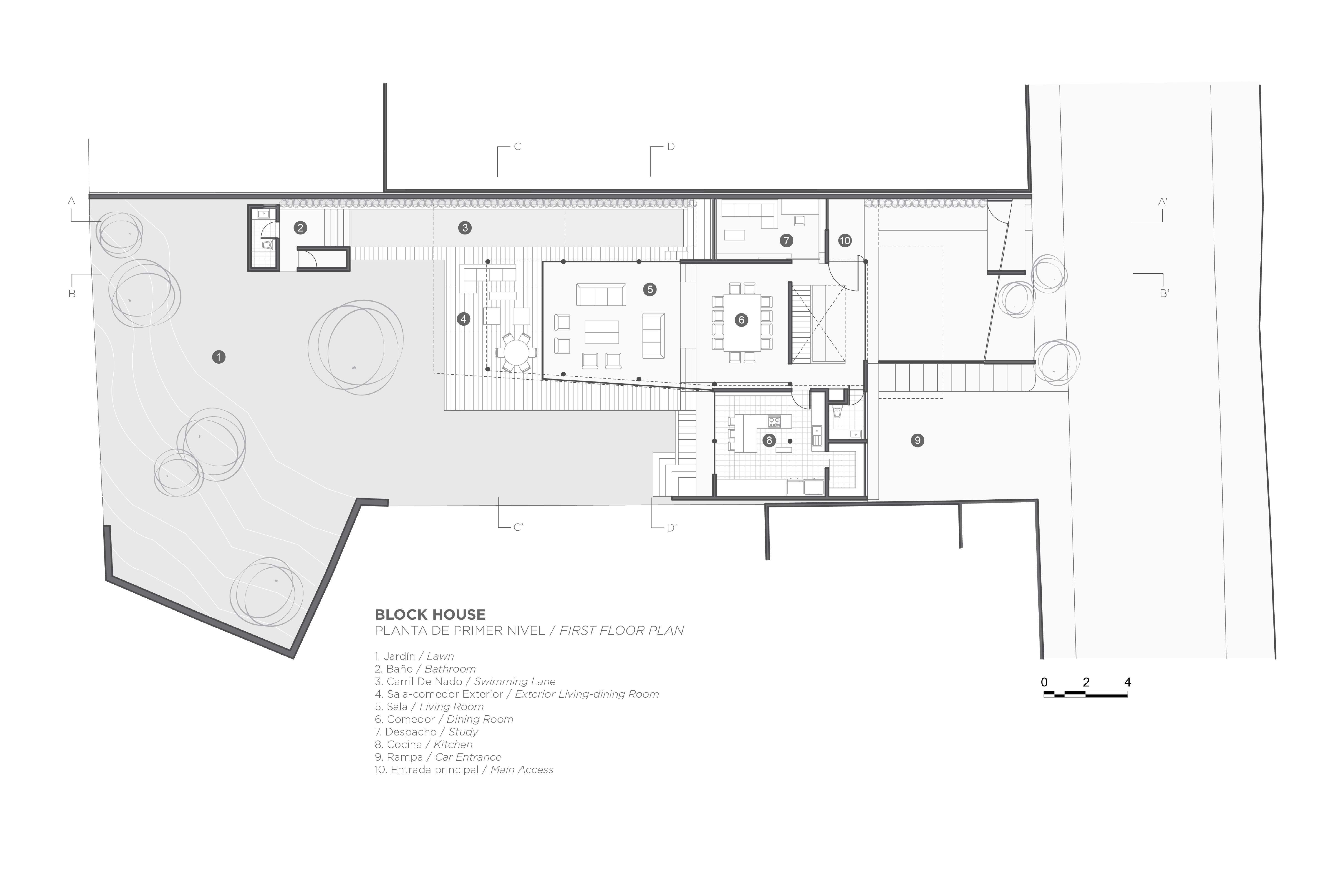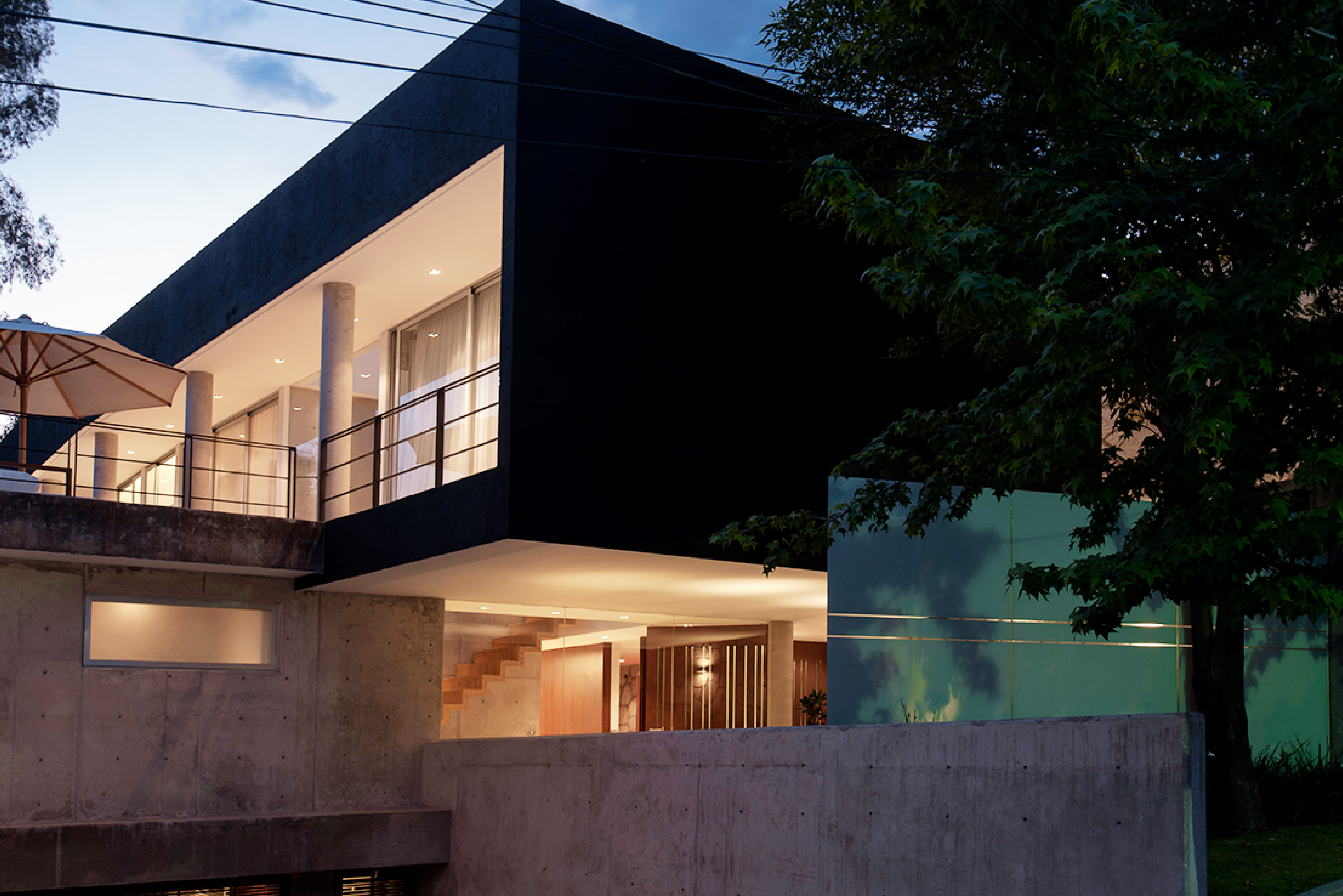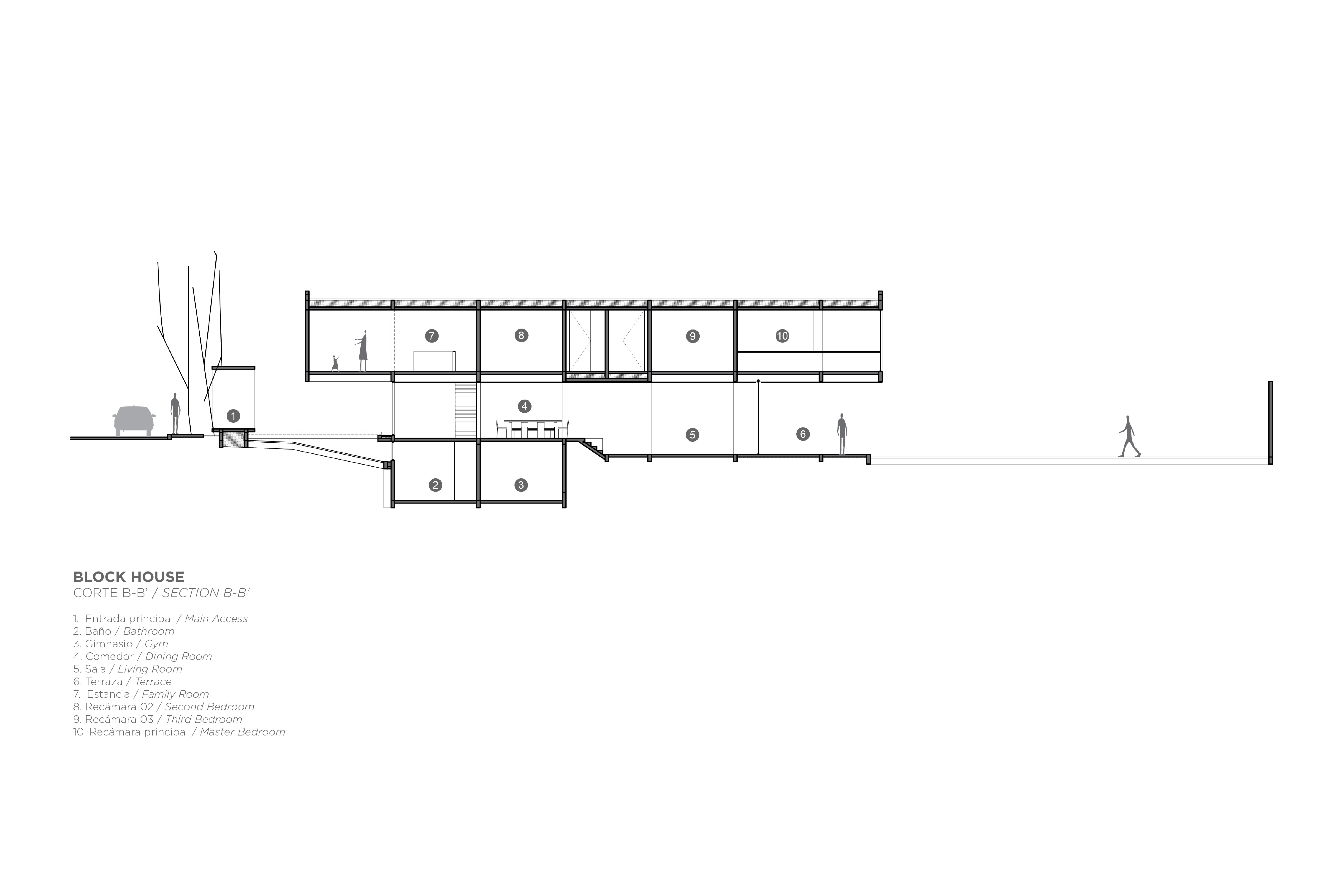 Block House nace a partir de la superposición transversal de dos volúmenes, creando un juego de contrastes entre sólidos y vacíos. Un prisma longitudinal de concreto negro cobra protagonismo al elevarse del terreno y posarse sobre otro, de concreto gris, en un equilibrio no geométrico. El carril de nado, elemento fundamental en el que tuvo origen el encargo, se ubicó a un costado de la colindancia, desplazando el volumen y abriendo así una entrada de luz hacia la planta baja, que baña toda la extensión de la casa.