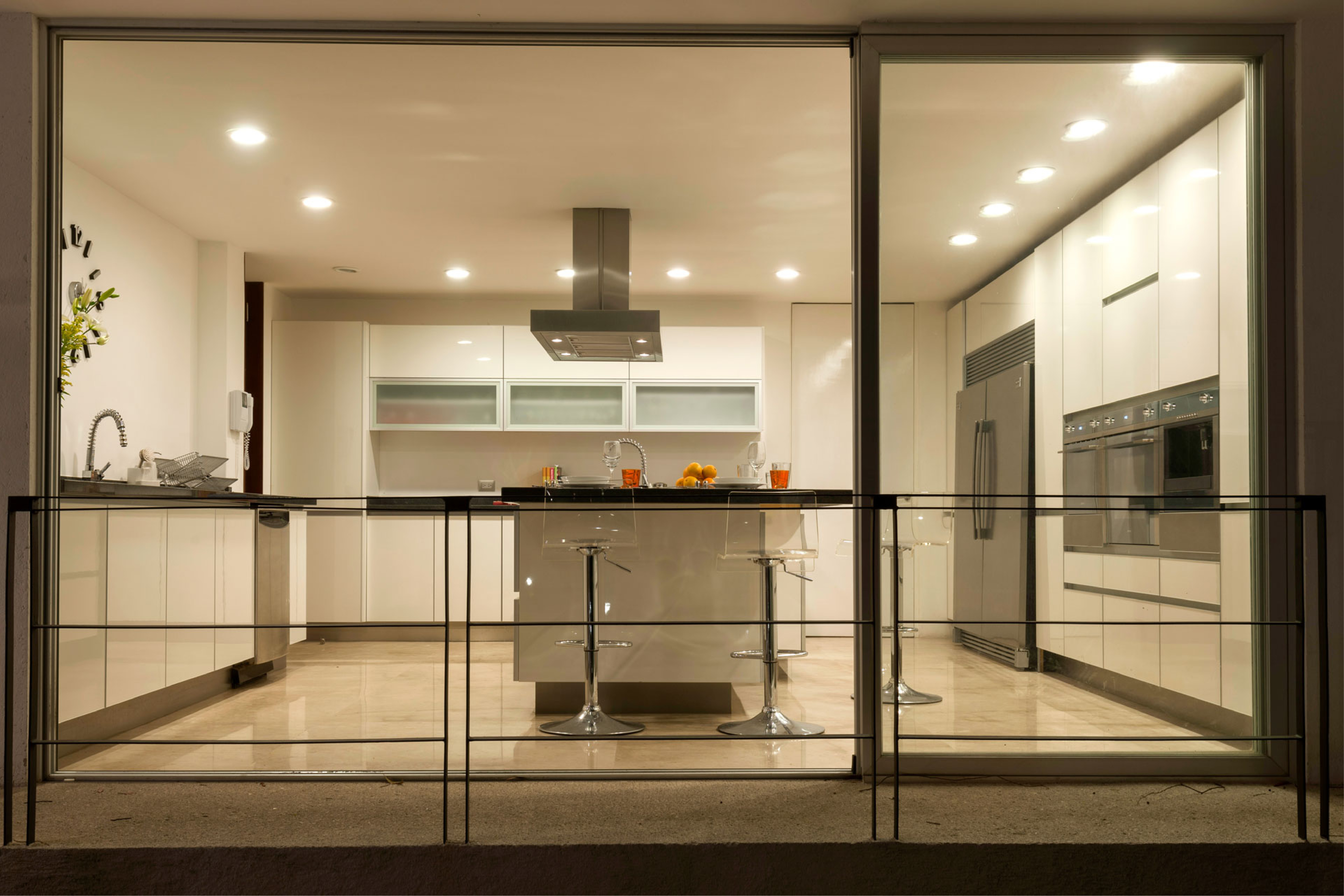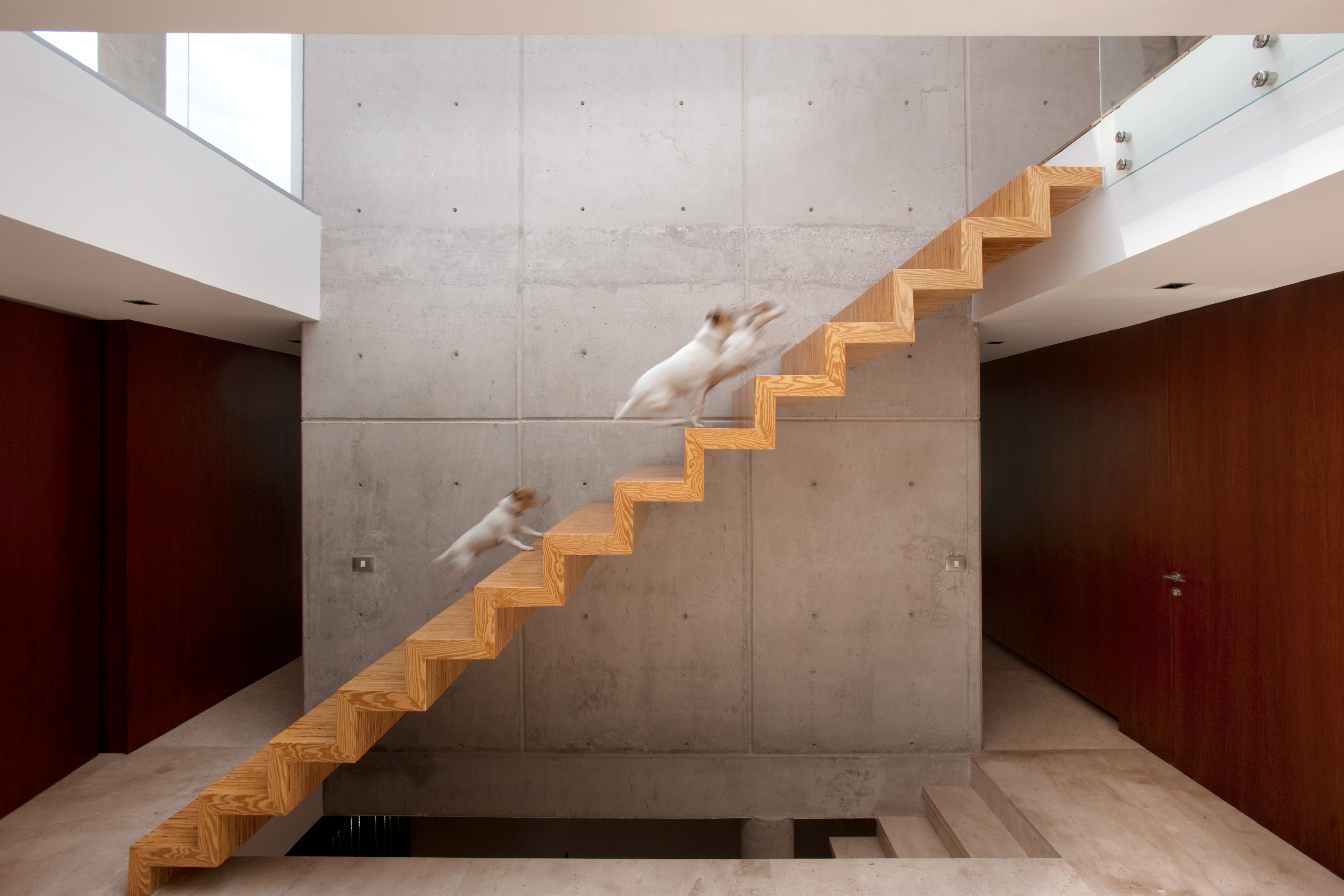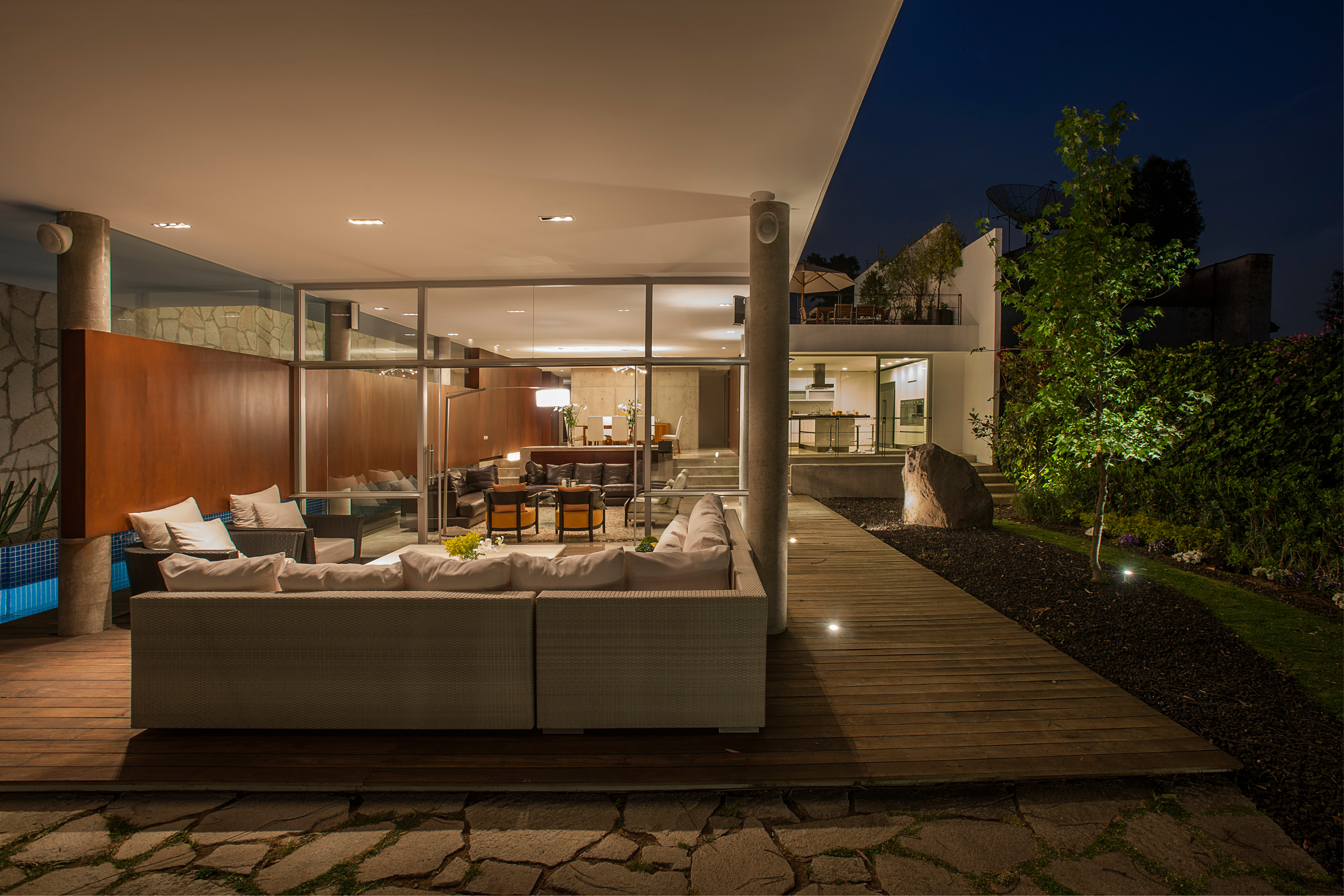 Bajo el volumen suspendido se ubicaron las áreas comunes, en directa relación con los exteriores, mientras que las áreas privadas se ubicaron arriba, en una condición de mayor intimidad. La azotea del volumen transversal se aprovecha con una terraza, que da servicio a toda la planta alta.