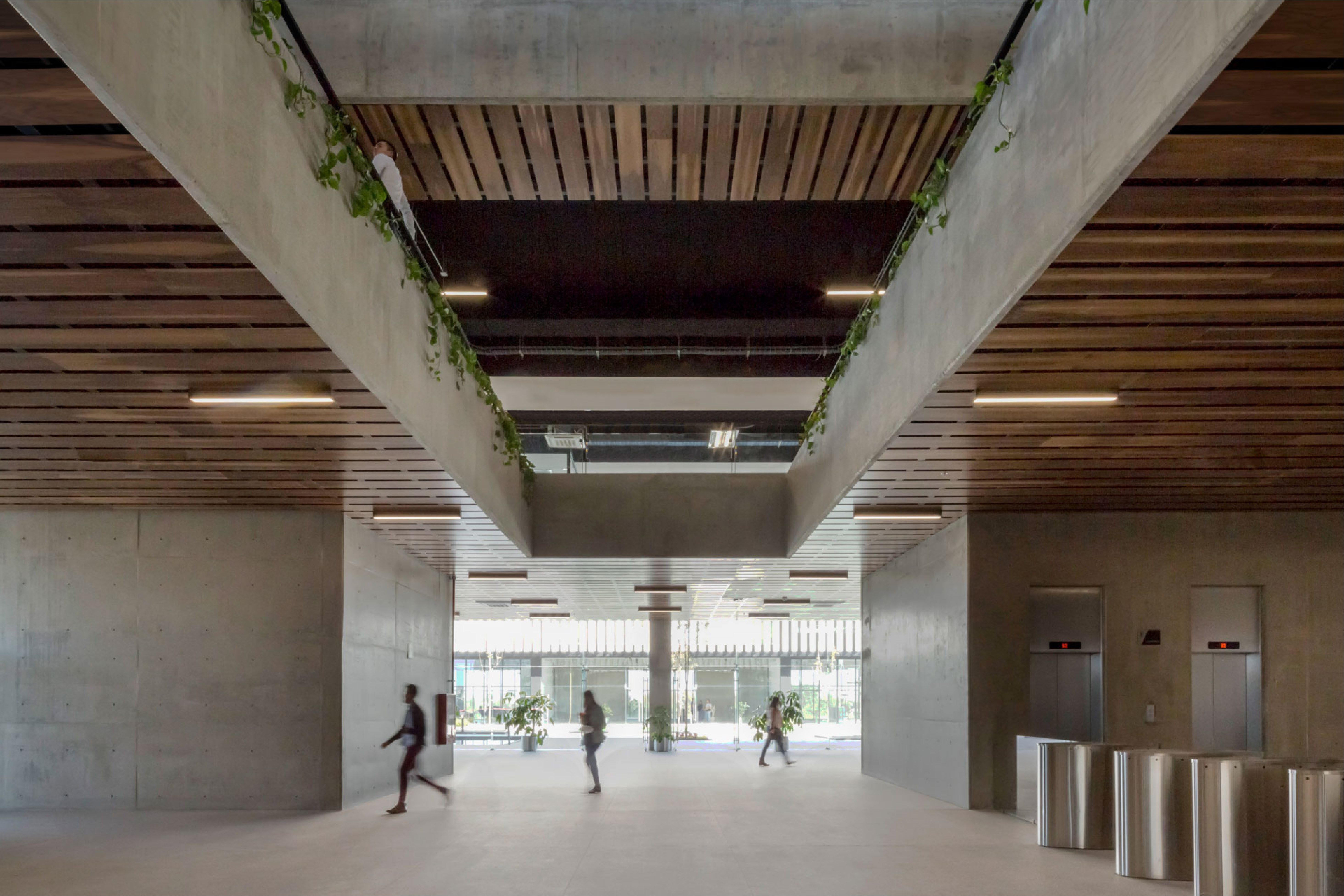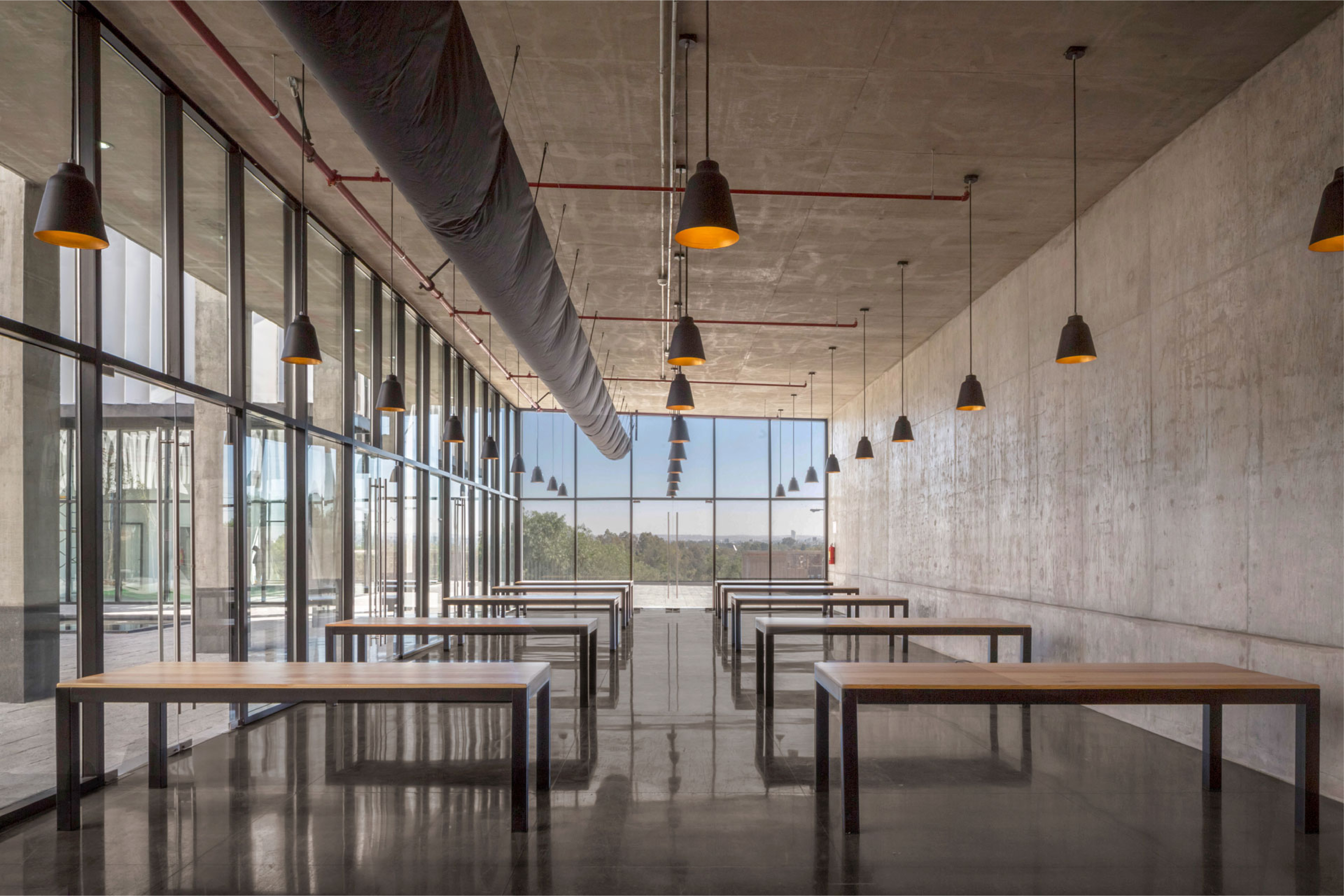 La disposición arquitectónica buscó crear un campus que contara con una plaza central, que a su vez funcionara como distribuidor de circulación y como punto de encuentro y construcción de comunidad. Para ello, se dispuso de tres volúmenes (dos de oficinas y uno de comedor) separados entre sí, que dieran lugar al dicha plaza y a su vez la protegieran con la creación de sombra. También, se incluyó vegetación y espejos de agua que ayudan a generar un micro clima que proporciona un excelente confort climático como un lugar de estancia.