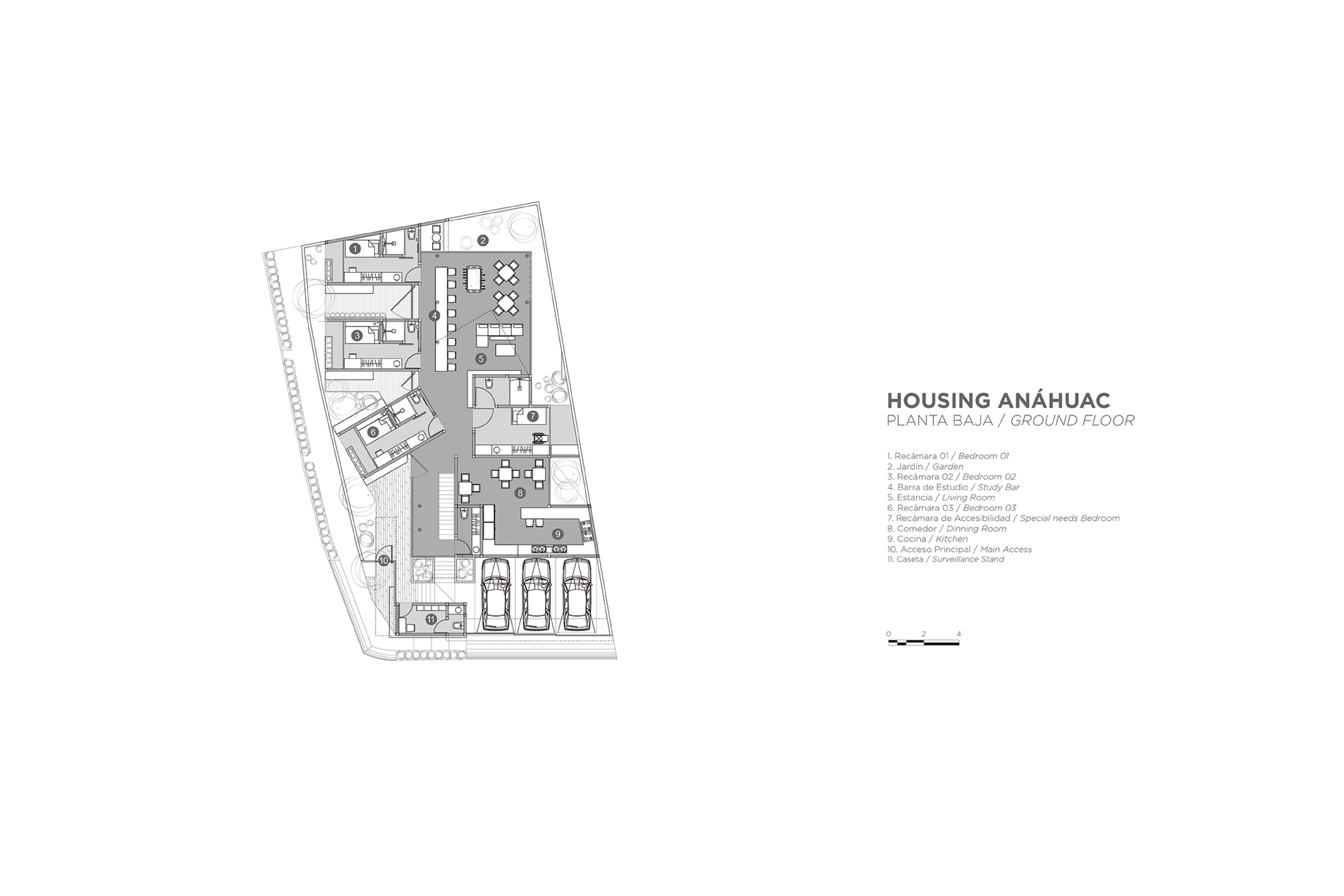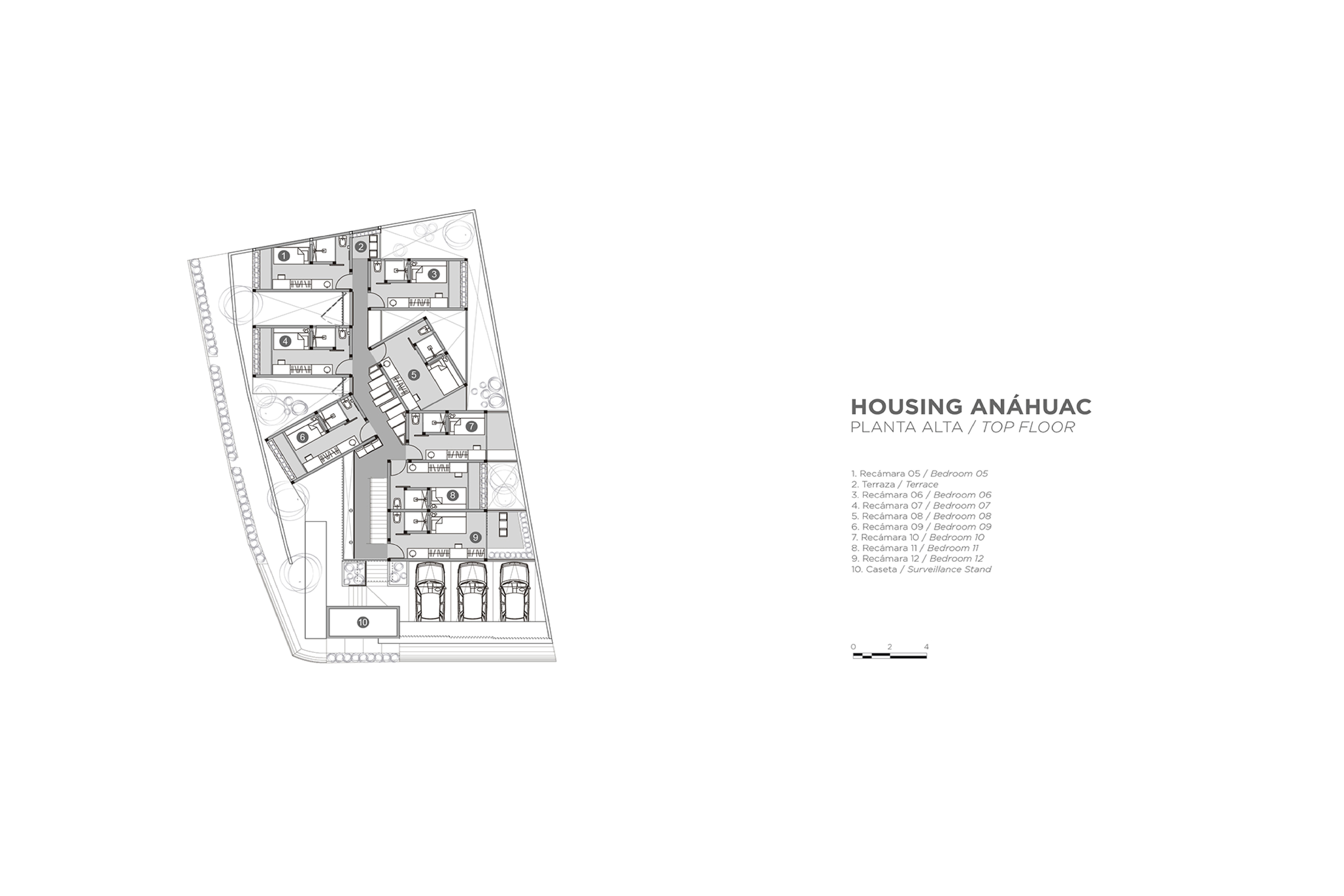 El conjunto cuenta con cuatro plantas, en las que se complementan las recámaras y los espacios de uso común: dos salas de estudio, un área de recreación, dos áreas lounge en el roof garden, dos cocinas integrales, un área de comedor, un gimnasio y área de servicios de mantenimiento.