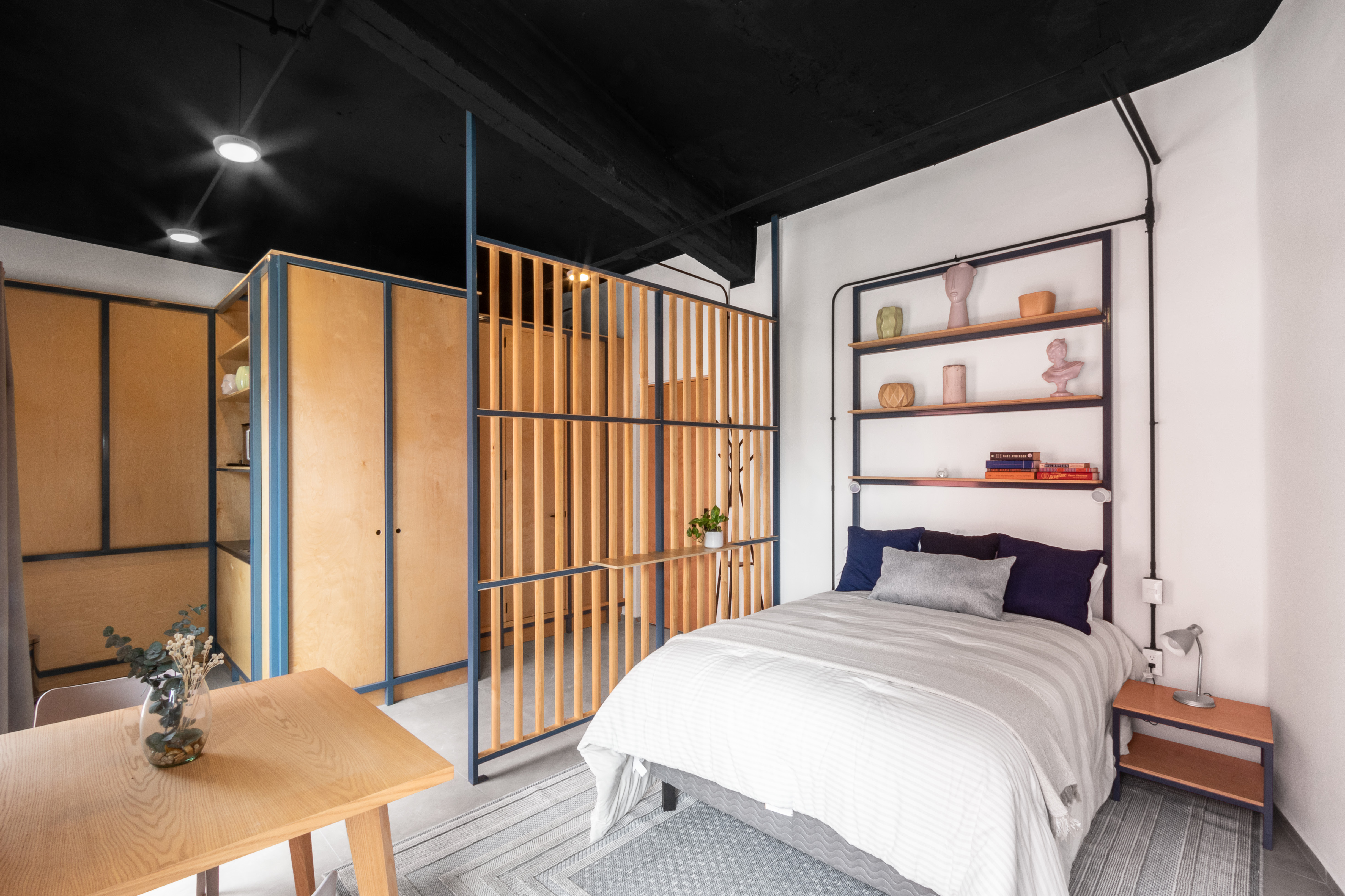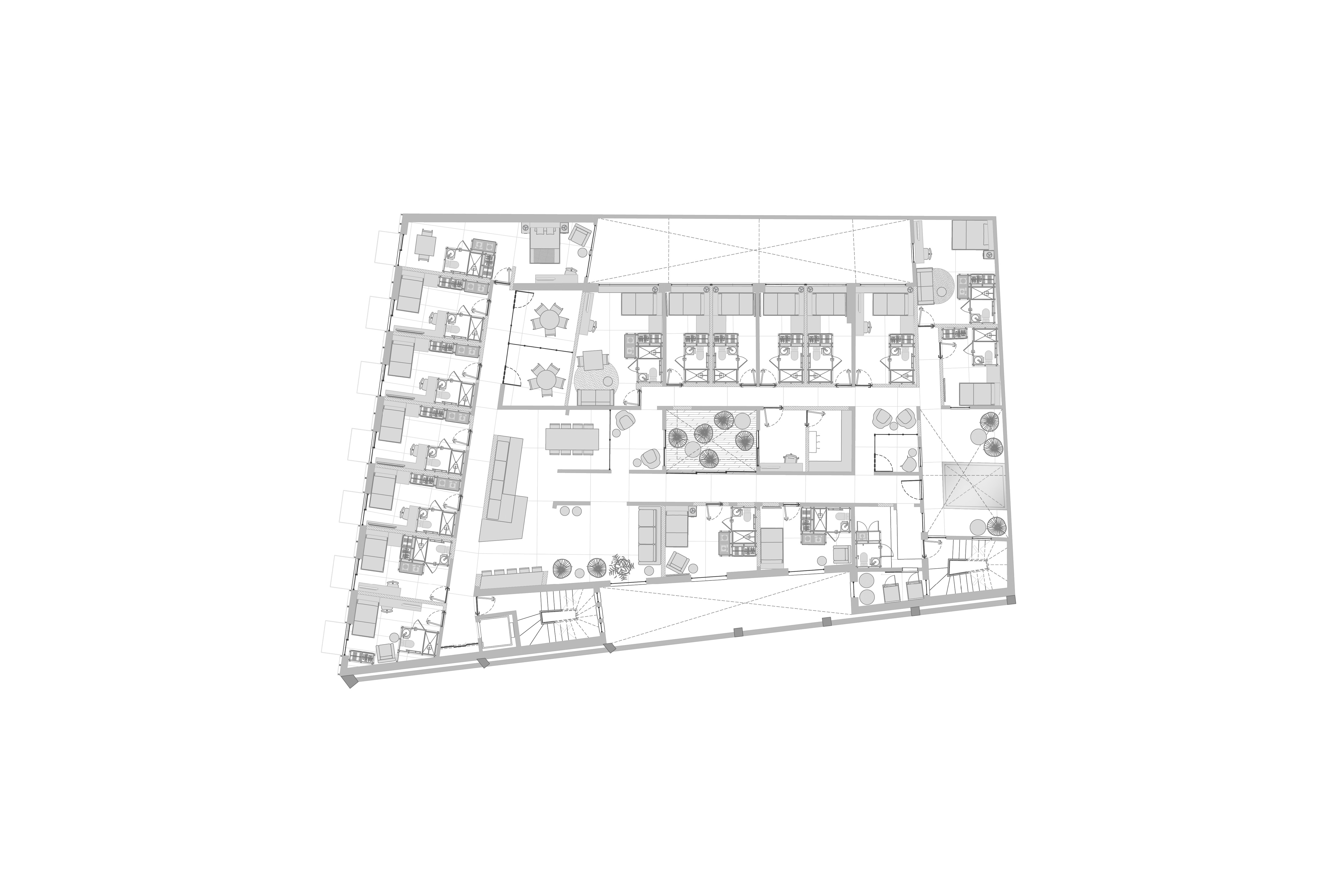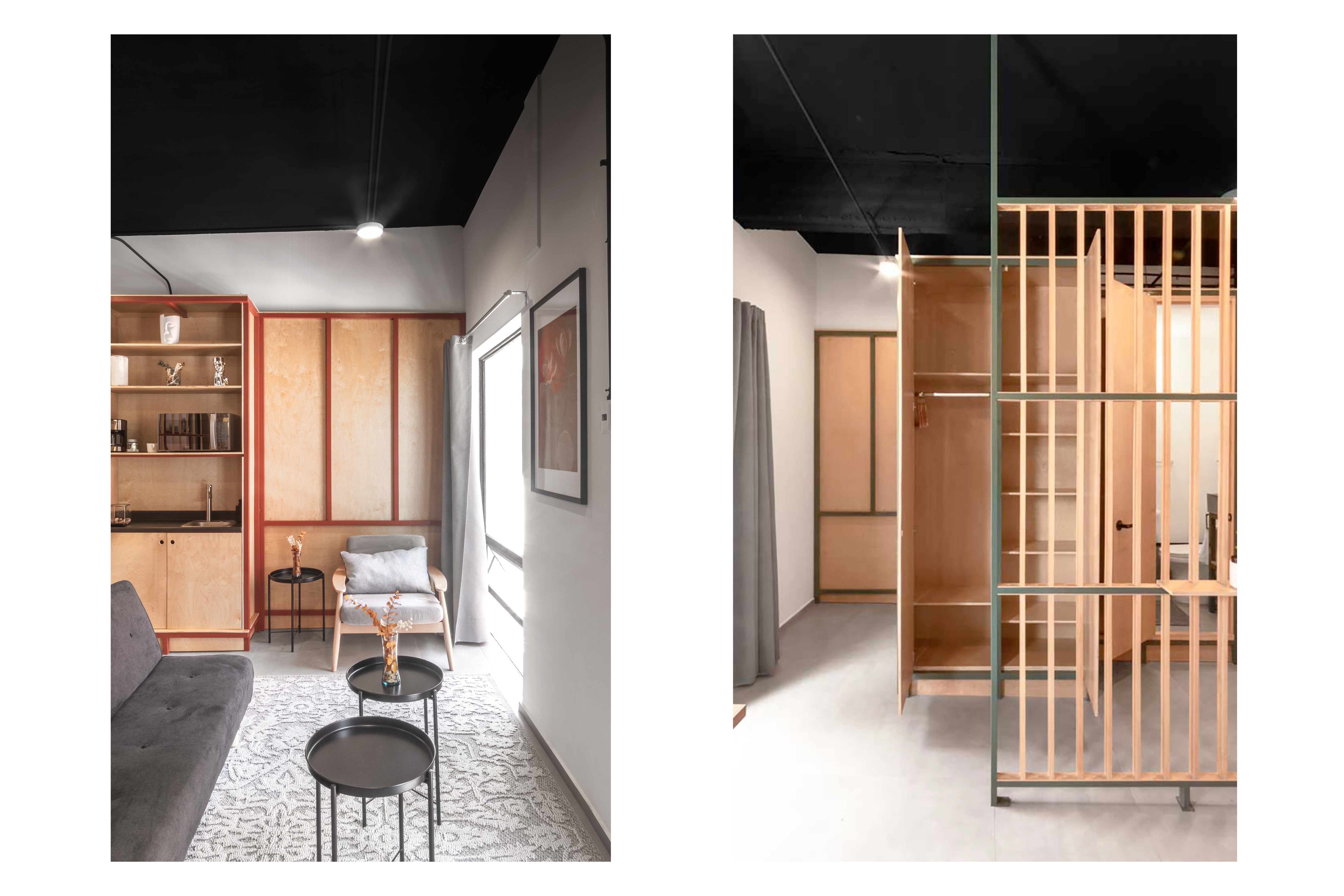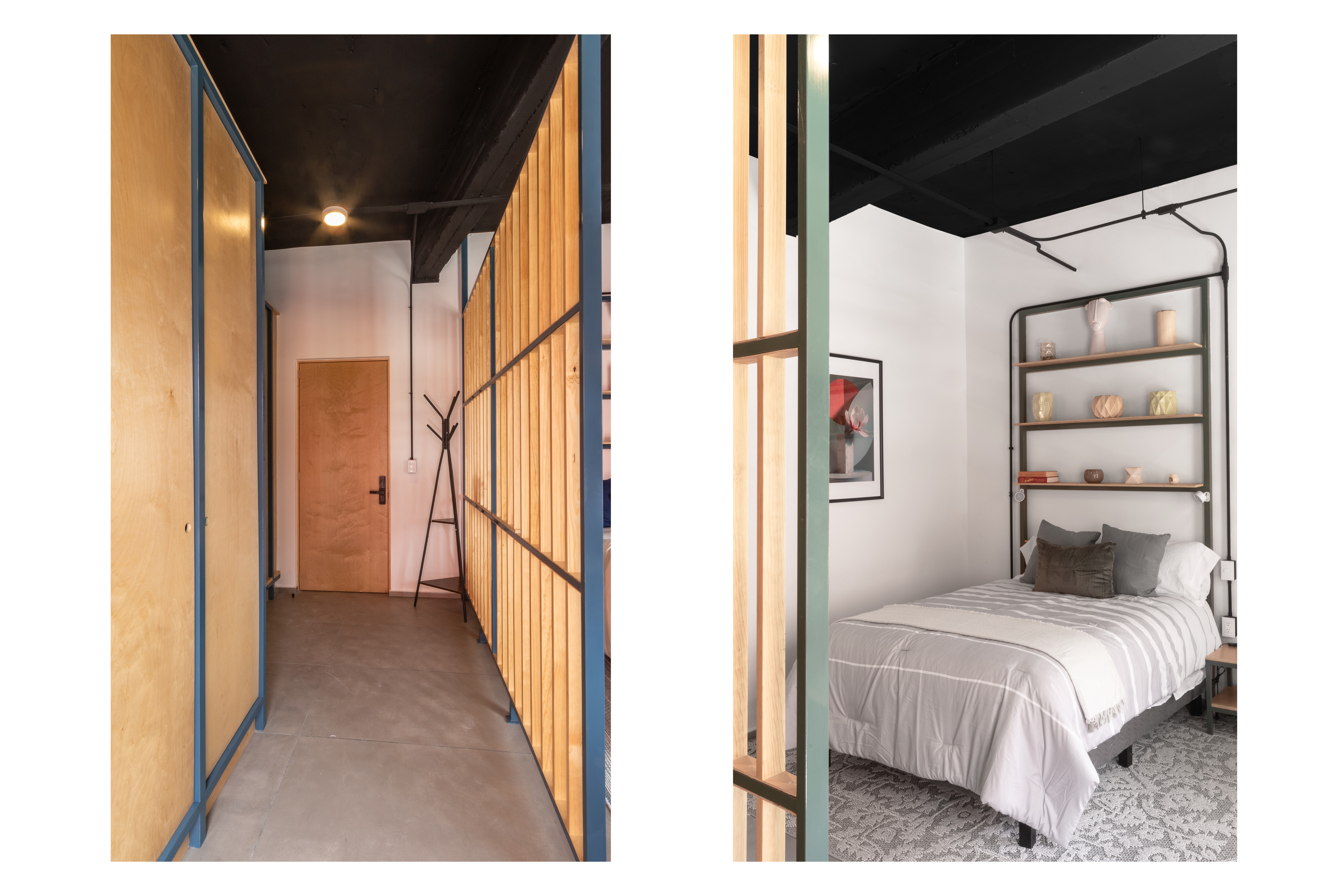 La introducción de estructuras de baños independientes fue clave para viabilizar el proyecto. Estos elementos funcionales se convirtieron en muebles que albergan baños y esenciales, permitiendo dos tipos de unidades habitacionales. Las más grandes, de 18 a 23 metros cuadrados, incluyen cocinetas; las más pequeñas, de 11 metros y medio, tienen baños privados. La materialidad desempeña un papel esencial en la transformación. Los pisos de madera de encino aportan calidez, mientras los muros divisorios de tablaroca permiten flexibilidad en la distribución. Las altas alturas del edificio se aprovecharon para dejar las losas expuestas, creando un ambiente industrial y moderno.