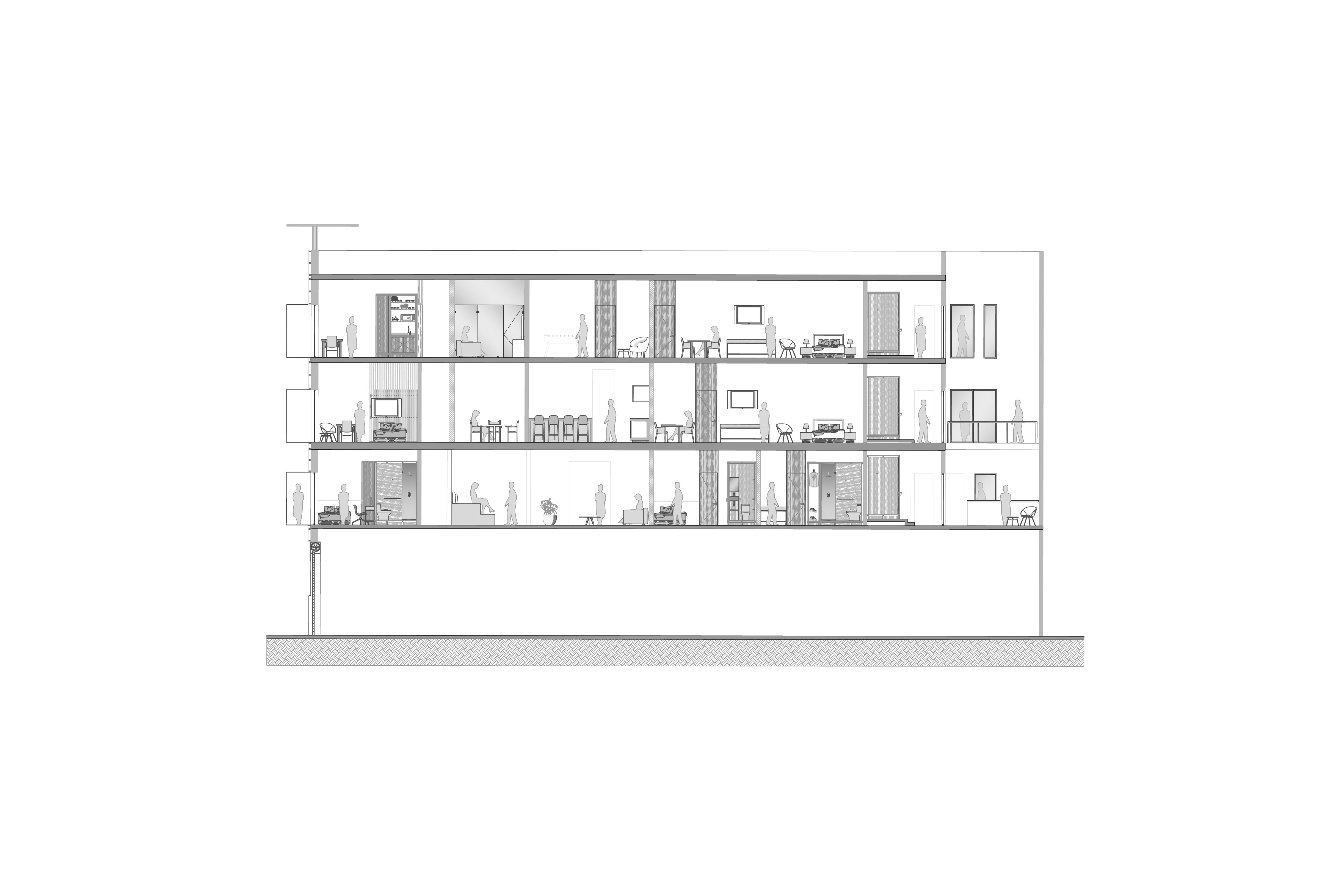 El primer nivel alberga un espacio de coworking, fomentando la colaboración. El segundo nivel presenta una cocina común para promover la interacción culinaria. Por último, el tercer nivel ofrece áreas recreativas, creando un ambiente vibrante y social.