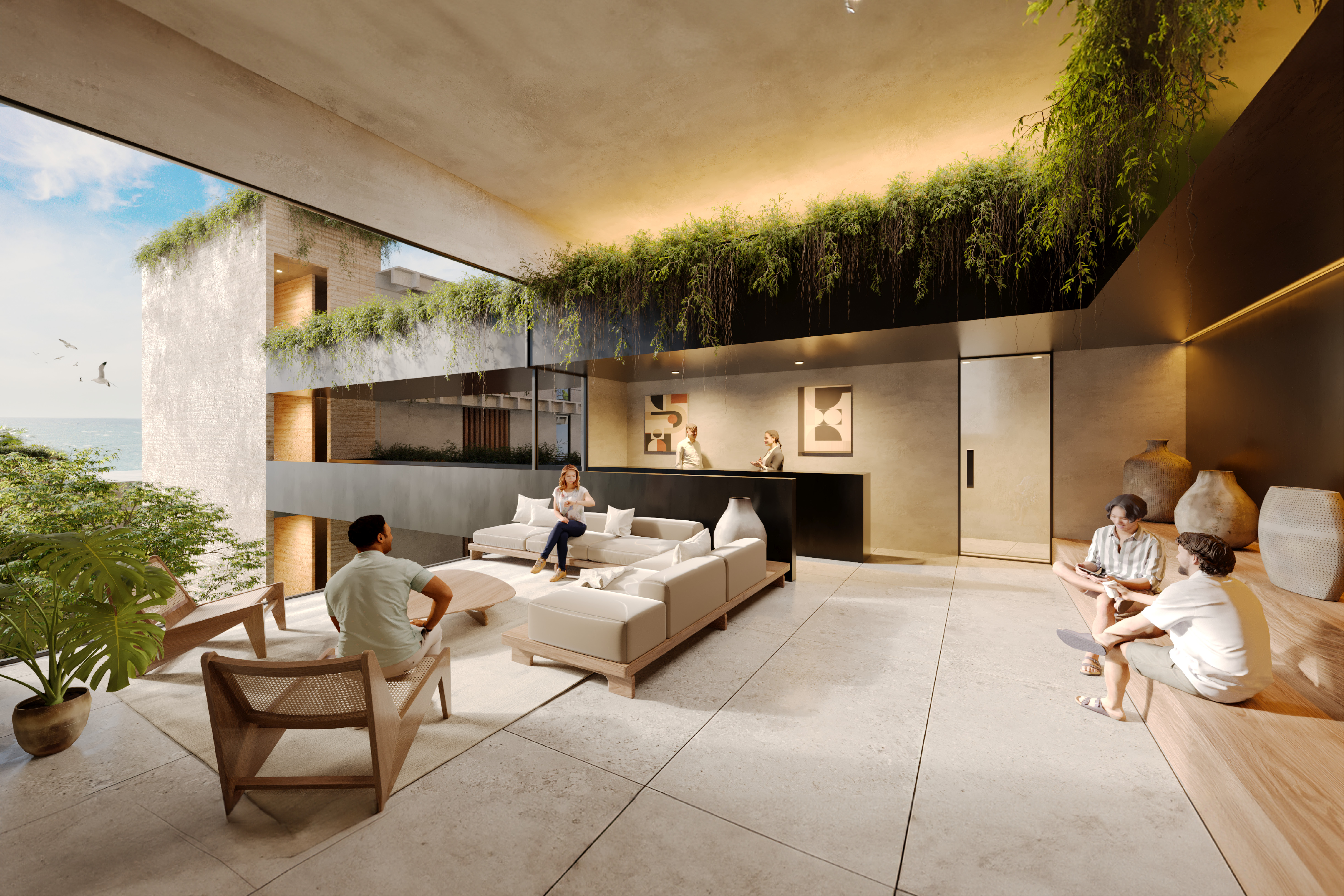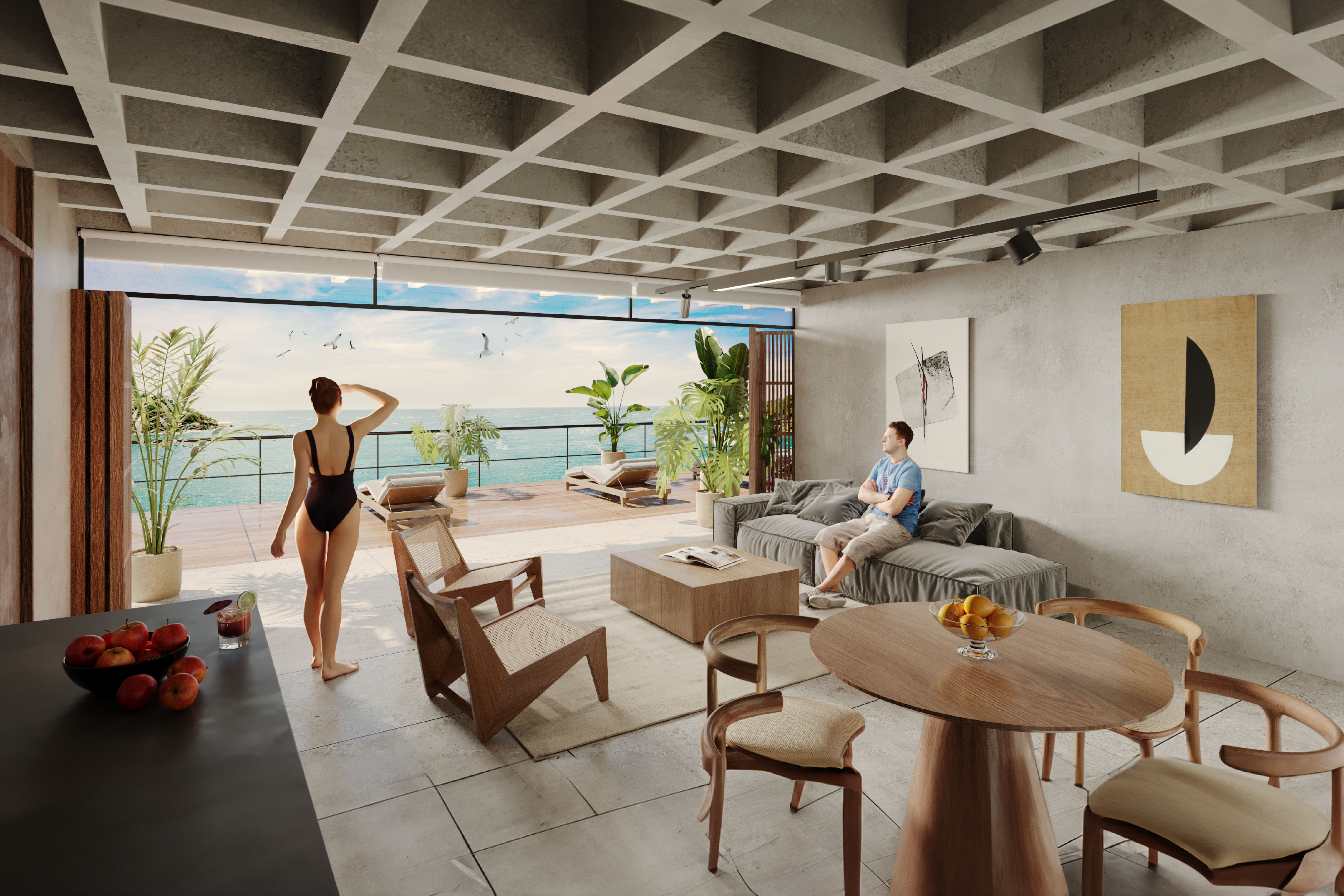 Para hacer módulos funcionales y adaptables a la topografía se utilizó un sistema constructivo de columnas con losa reticular. La losa reticular aparente, además de ser parte del diseño interior, permite que la azotea de un usuario se convierta en la terraza del otro, optimizando el espacio destinado a los exteriores. Con una materialidad enfocada en elementos de madera, vidrio y concreto, se logra abrir las fachadas hacia el entorno natural, generando vistas de 270° hacia el mar abierto. Cuando sea requerido cerrar los ventanales, los Louvers de madera aislarán el interior, mientras en el exterior la madera de este cerramiento se estará mimetizando con la colorimetría del paisaje.