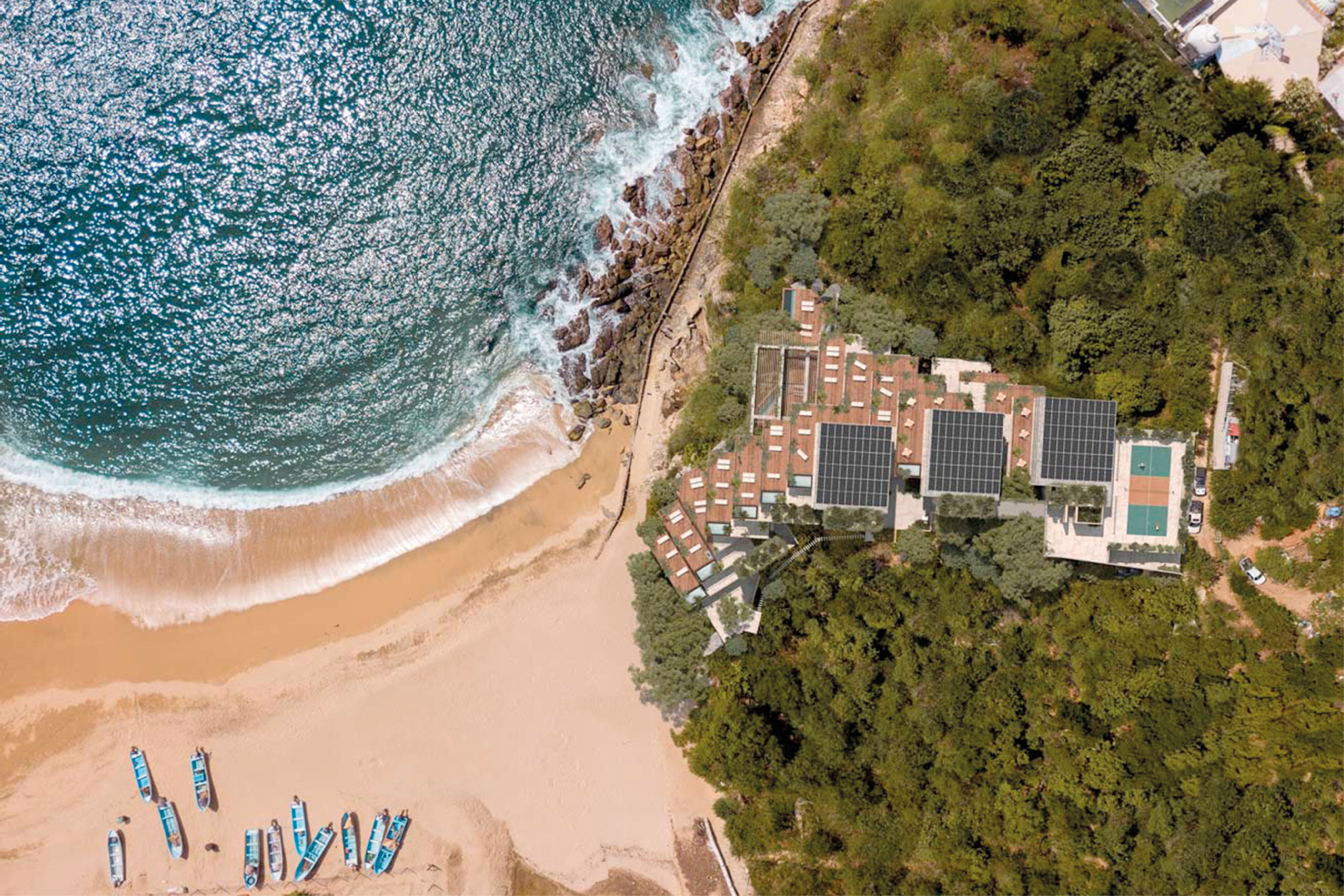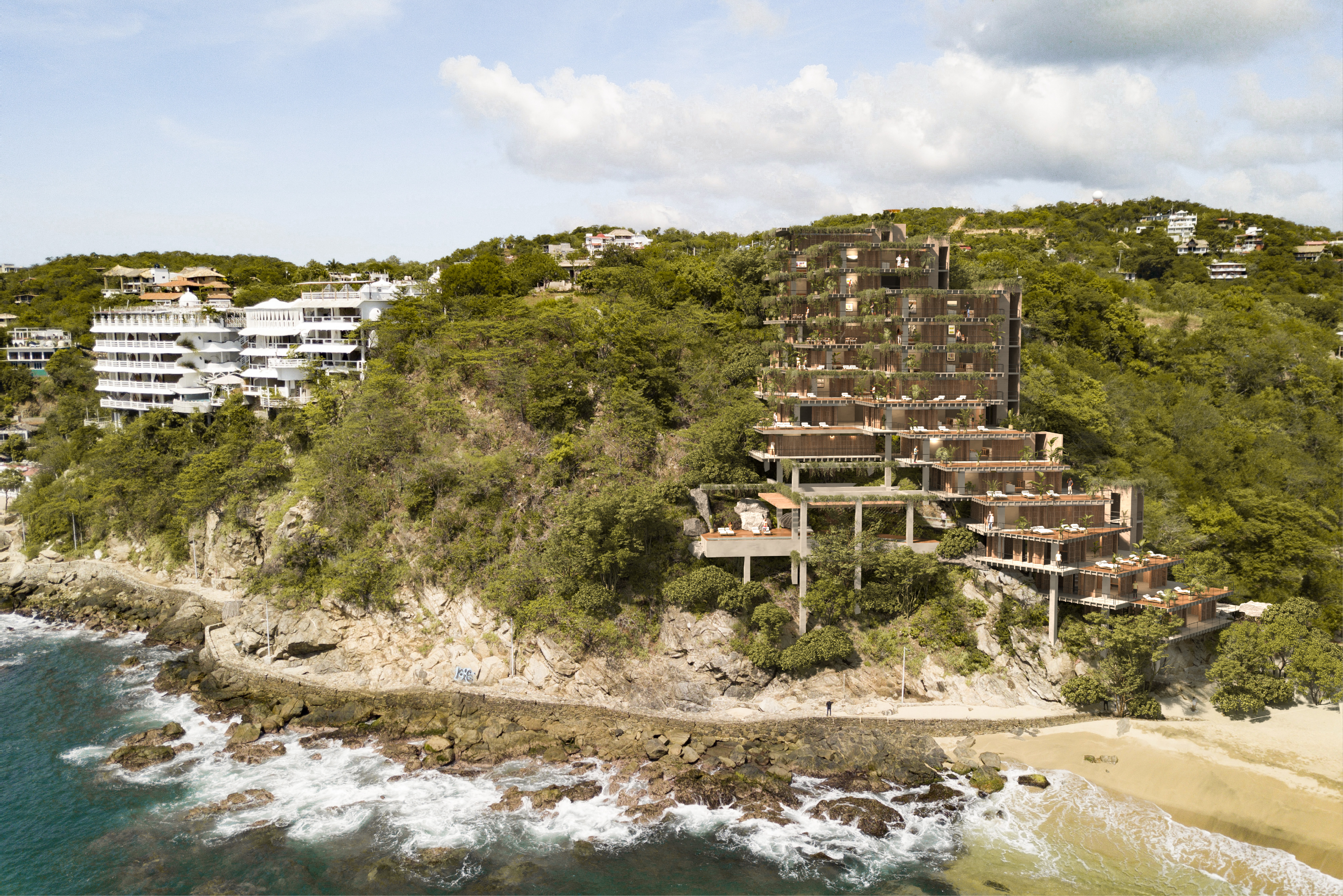 Puerto Ángel es un conjunto de suites de alto lujo ubicado en la Bahía de Puerto Ángel en Oaxaca. Este desarrollo se integra en un predio caracterizado por su pendiente aproximada a 50° de inclinación en un entorno compuesto por acantilados. El reto: ¿Cómo generar un proyecto de desarrollo inmobiliario que sea respetuoso con el contexto, el terreno y que proponga un diálogo saludable en torno a la arquitectura vertical? ¿Cómo haces un edificio sin hacer un edificio?